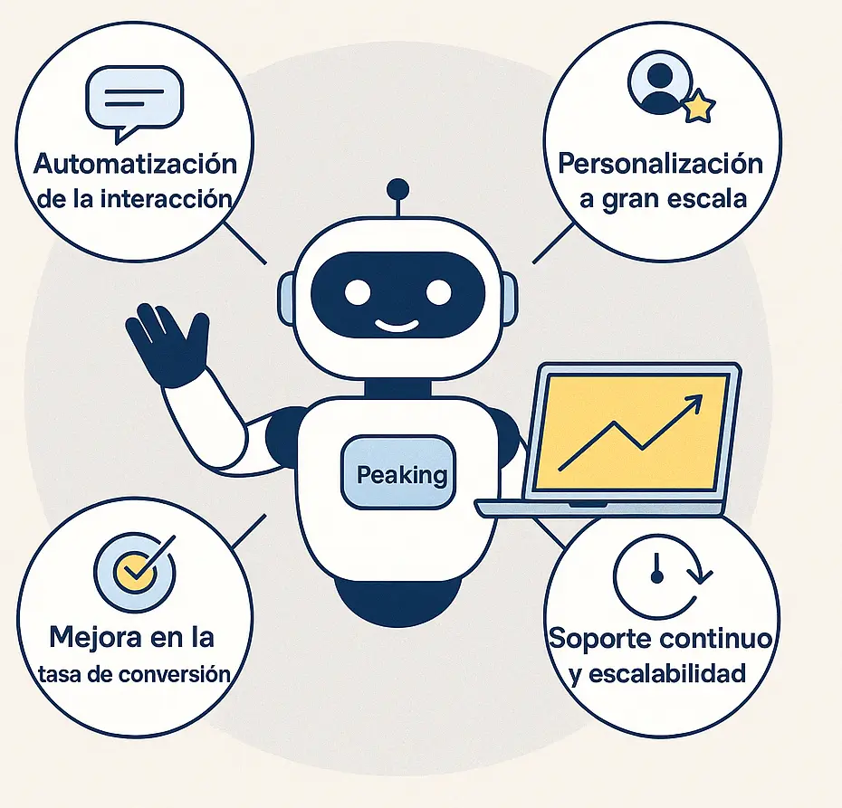 Cuando un cliente se comunica por un canal digital, Peaking responde inmediatamente, proporcionando respuestas rápidas y soluciones a las inquietudes comunes. Esto no solo mejora la experiencia del cliente, sino que también libera a tu equipo de ventas para que se enfoque en tareas de mayor valor, como la negociación de acuerdos o la personalización de la oferta.